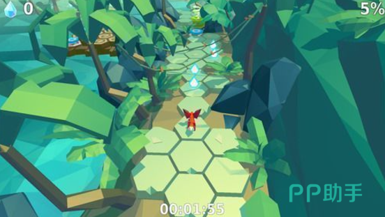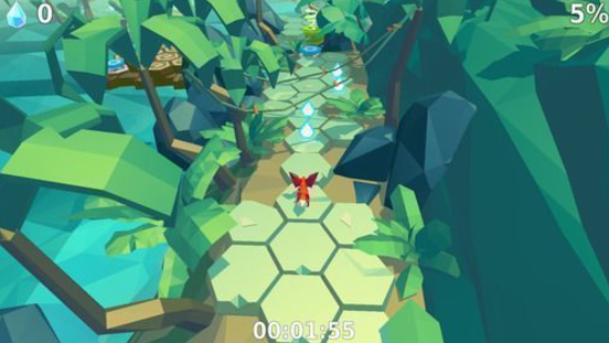 游戏中的地图风格各异,每一张都像是一个独特的小世界等待玩家去探索。特别要提到的是其六角形的地形设计,这一设计在众多跑酷游戏中独树一帜,再加上3D像素的美术风格,使得整个游戏画面极具辨识度,玩家一眼就能在众多游戏中识别出它的独特之处。小狐狸的动作十分灵活,仿佛是真实的小动物在森林中穿梭跳跃。而舒缓的音效更是锦上添花,与游戏画面完美搭配,让玩家沉浸其中。