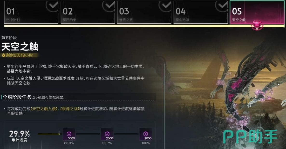在此期间,玩家可以前往边境区域以及大世界的任务栏当中,领取自己的专属任务,由于天空之触属于全服务器的战斗任务,玩家每一次完成天空之触入侵以及根源对战时,都会累加赛季进度,当赛季进度推进到33%、66%、100%时,玩家分别可以获取三千点、两千五百点、两千点的星彩积分点数。