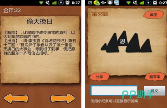 此款益智类型的能帮助大家掌握很多词语并学习,看到了里面给出的图片以后需要了解它到底是什么意思,在写答案的时候,无论是文字类型或者是拼音类型都是没有问题的,是娱乐学习时不二选择。有多种难度可以挑战,同样也能在完成以后了解解析出处。在需要动脑筋的类型中,它有丰富的题库,感受你的大智慧。