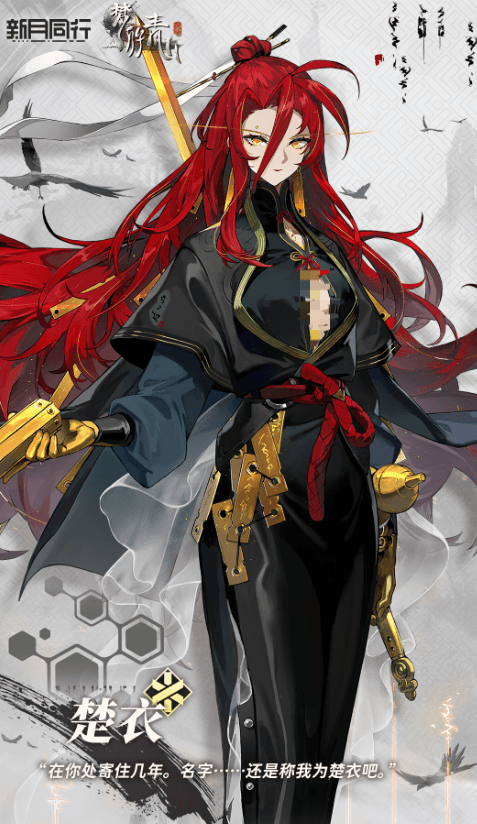 楚衣是一位修行者,有一头红色的长发,眼神非常的锐利,经常给人一种不好相处的感觉,关于她过去的一切似乎都是谜团,自身最擅长的事情是等待,喜欢的事物是最新型的技术。