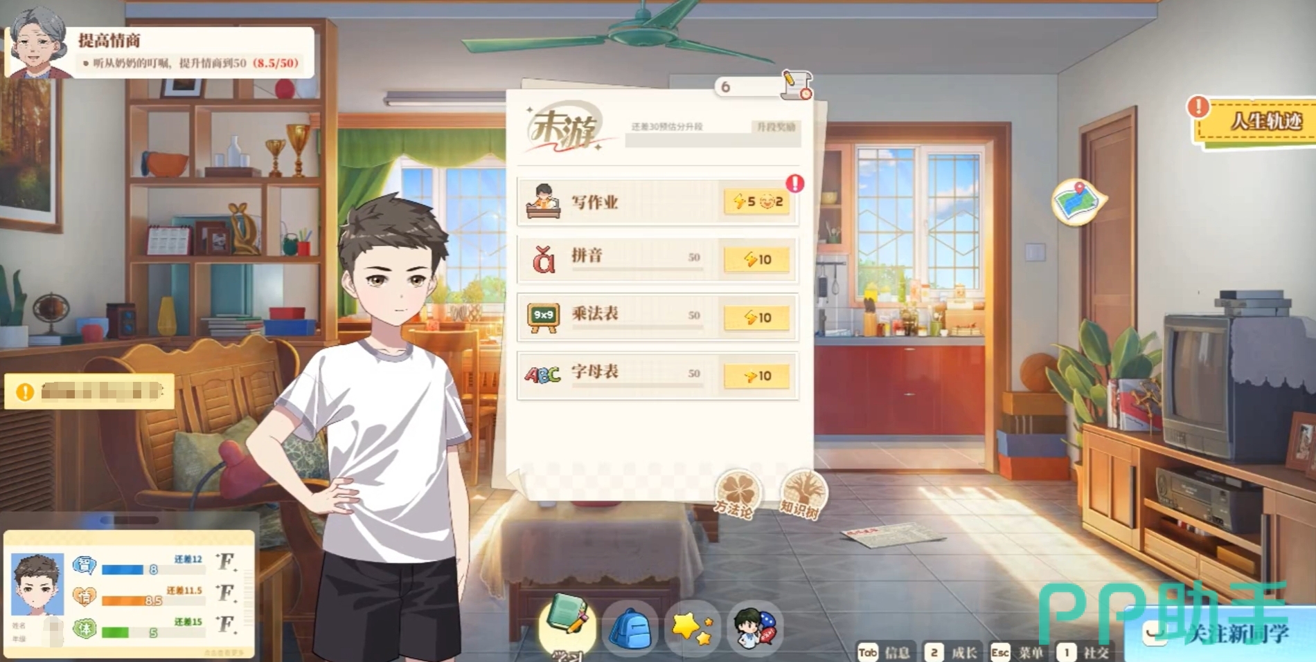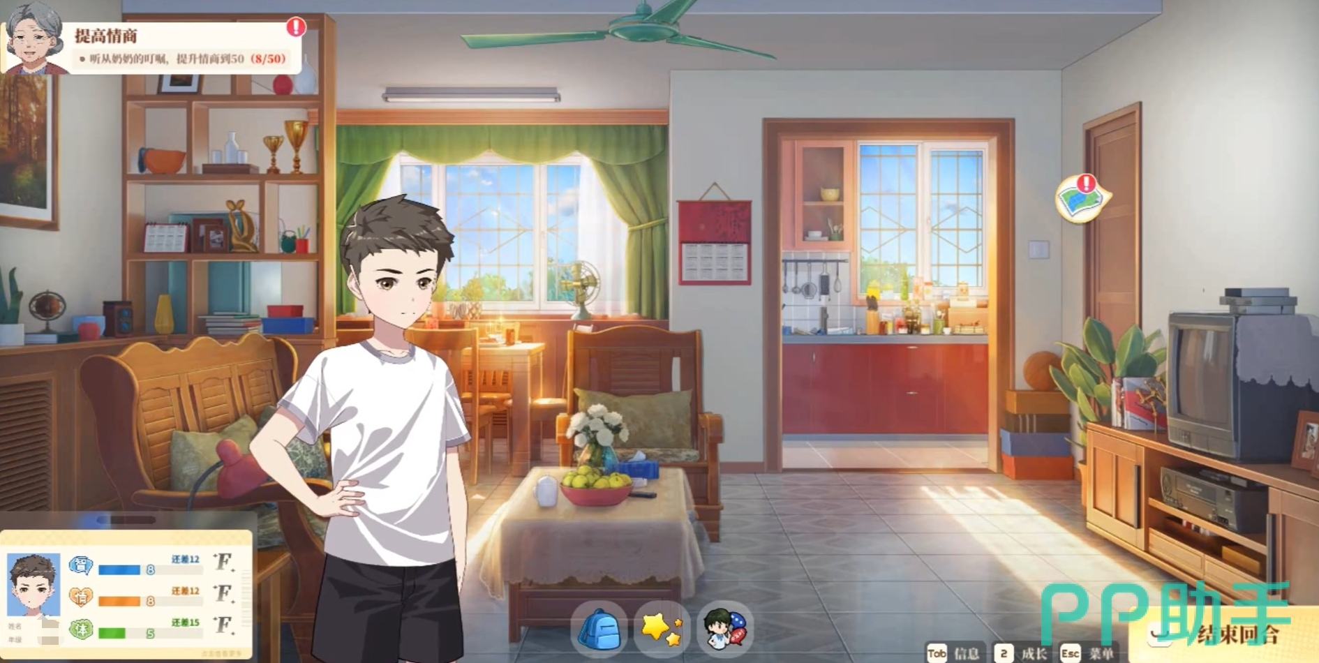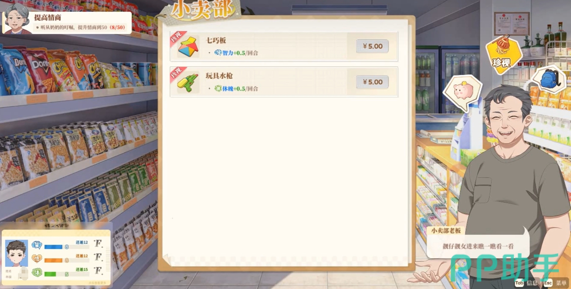 游戏内的回合其实就是天数,当人们用完当天的精力后便可结束回合跳至下一天,此时精力会全部恢复。每次进行行动时都会耗费一点的精力,这使得人们当天能处理的事项很有限,唯有合理的去分配精力才能让所获得属性收益最大化,同时人们也可利用小卖部里的各类道具,来提供获取属性收益的效率。