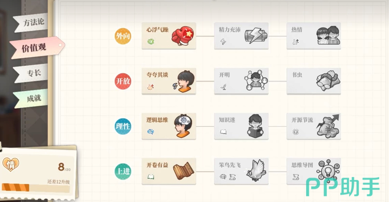 游戏内还有类似点亮天赋树的玩法,它们决定着玩家们能把主角培养成一个什么样的人。该玩法相当的细致,每个天赋都需要一定的条件才能进行解锁,但好在解锁条件都有着相应提示,如果各位对角色有明确的培养方向,可根据这些条件来决定角色的行动。