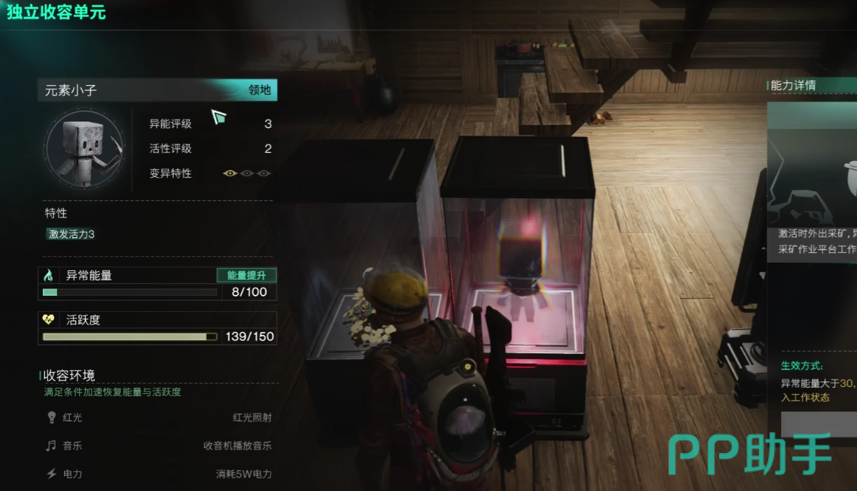 在获取了元素小子之后,建议玩家给它建立一个独立的收容单元,在提供了一定能量数值时,元素小子的活跃度达到满值,就能够主动为玩家工作,元素小子的收容条件要求玩家进行红光照射,并且随时播放收音机音乐,元素小子每一次帮助玩家活动时,都会消耗五万点的电力数值,玩家在前期一定要收集元素小子,帮助自己挖矿。