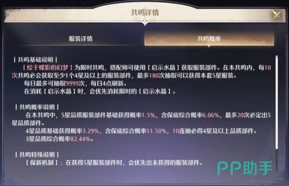 常驻卡池的保底机制与限定卡池相似,但也有一些细微的差异,在常驻卡池中,每20次抽取保底获得一个5星物品,180次抽取保底集齐一套完整的5星部件。5星物品的概率同样为1.5%,这一机制设计使得玩家在常驻卡池中的抽卡体验与限定卡池相当,既提供了稳定的保障,又保持了一定的挑战性。常驻卡池中的重复物品处理机制与限定卡池相同,当玩家重复获得一个5星套装部件时,该部件会自动转化为澎湃浪花和静谧水滴。