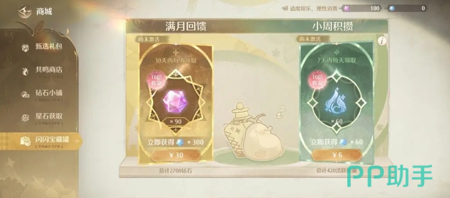 游戏中还有一种粉红色的货币叫做钻石,它同样可以通过直接购买获得,但更推荐的方式是通过订阅月卡或周卡来获取,以月卡为例,在有效期内,通常为30天的有效期,大家每天可以领取90颗钻石,总计下来就是2700颗,而选择周卡的话,则可以在7天内每天收到60点活跃能量,这就相当于体力值,总共420点。这两种卡片不仅提供了稳定的资源供给,而且从长远角度看性价比极高,特别适合那些希望快速提升自己角色实力但又不想一次性花费太多金钱的玩家。