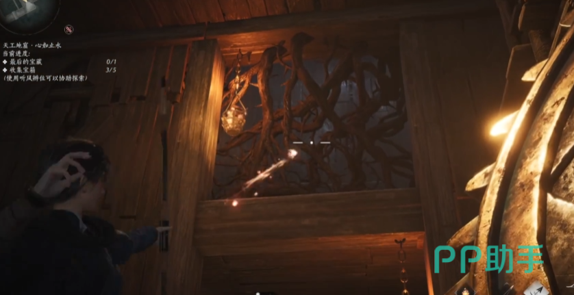 来到下层后在可以看到阁楼上的藤蔓,将其清理后就可以看到第四个宝箱。这里可以先跳到旁边的木雕上,然后再跳到齿轮、架子上面,这样就可以够到这个宝箱了。