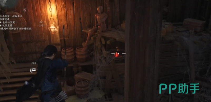 进入大门后左手边就是第二个宝箱,通过木梯爬上一旁的平台,可以看到被木板包裹着的火盆,火箭点燃火盆。