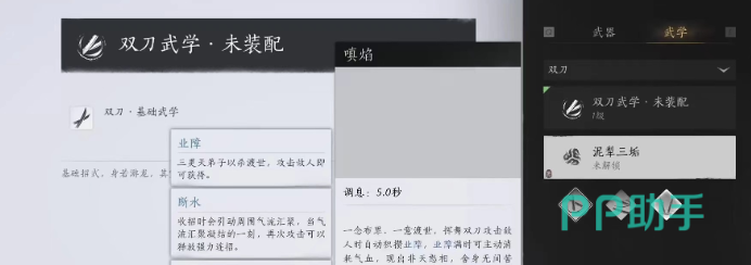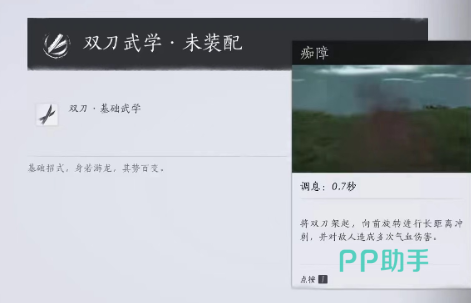 双刀的基础武学有三个,第一个是痴障,使用的时候会将双刀给架在一起,向前方旋转着进行长距离的冲刺,最后对目标造成多次伤害,第二个叫做贪祸,使用的时候会将刀踢到空中快速旋转,先造成多段伤害。