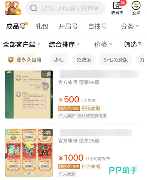 第一,帐号丰富。交易猫的九州异兽记帐号数量多,几千级成品号一大批,八千级服务器排名第一的帐号只要五百元,卖家氪金两万元重磅打造,战斗值爆表,还有超多仙石、器灵、圣器、道具、兽魂、神器等。