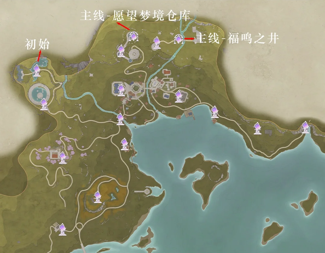 在花愿镇及附近的时候,小伙伴们除了初始点有一个柱子之外在初始点下方的位置也有一个柱子,可以一起解锁。随后小伙伴们过主线愿望梦境仓库的时候,也会解锁一个传送点,在这个传送点的左下方顺着道路走,还有一个传送点也可以解锁。然后就是主线福鸣之井的解锁点,也可以解锁两个。