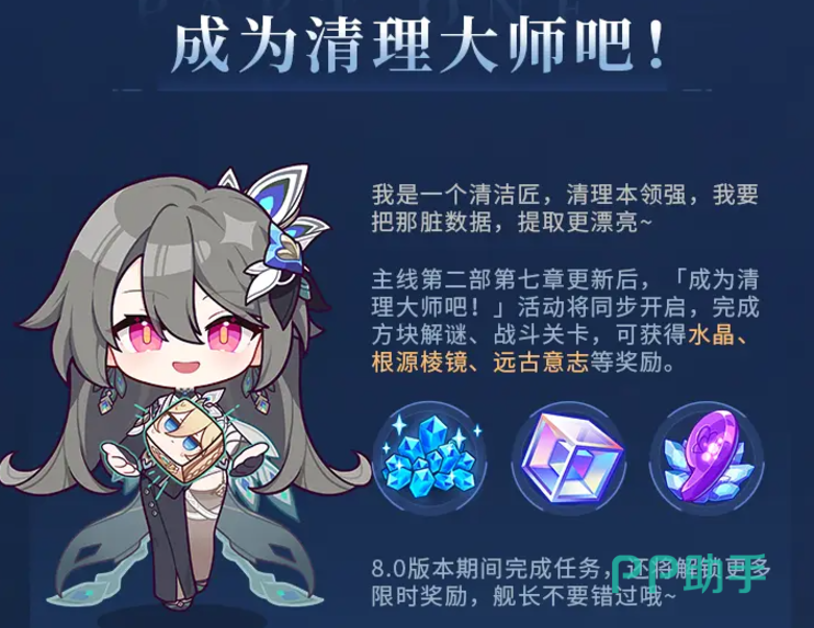 还会开放新的主线“怀抱旧愿的花束”,这是第二部第七章,推主线可以得到水晶、棱镜等奖励。主线更新之后还会同步开启“成为清理大师吧!”活动,参加活动完成解谜战斗,能得到水晶棱镜意志等奖励。