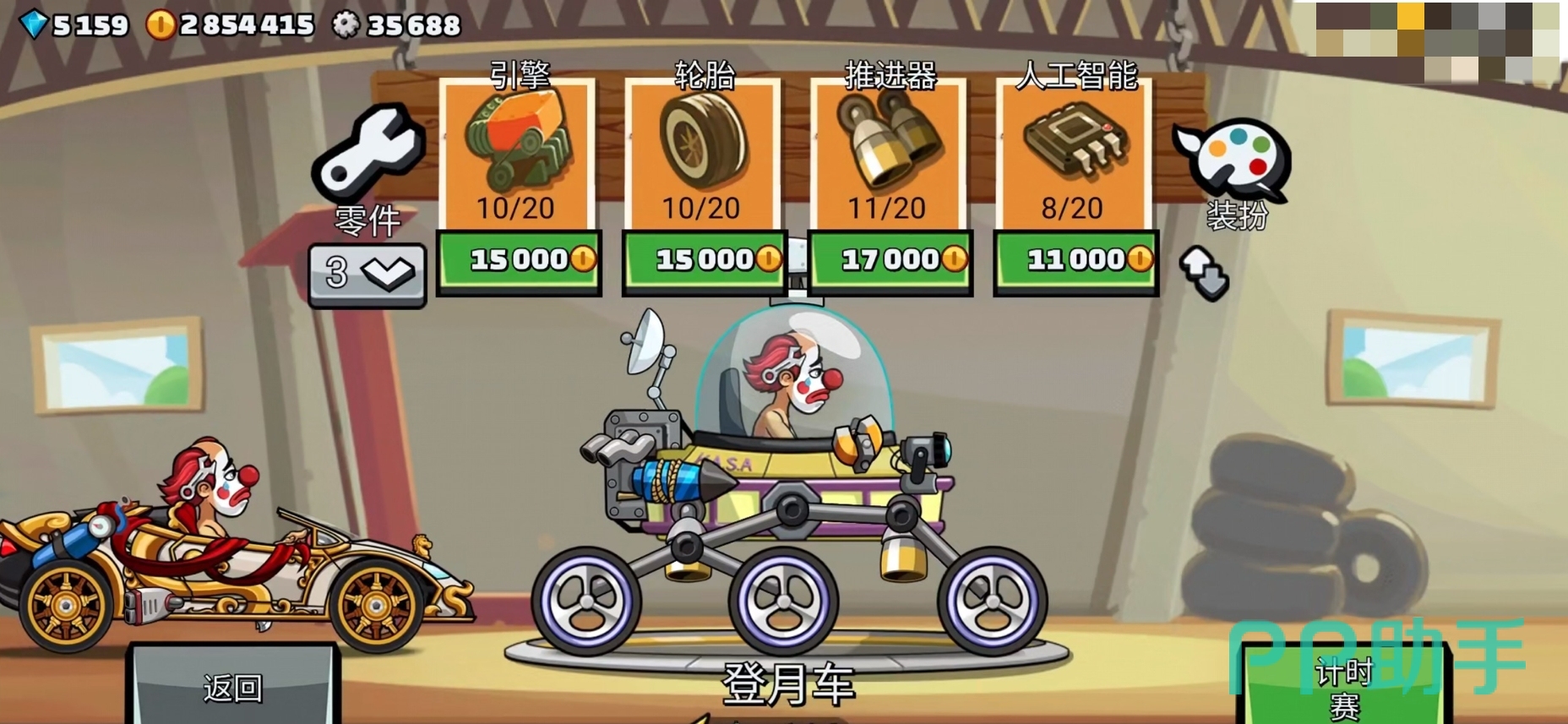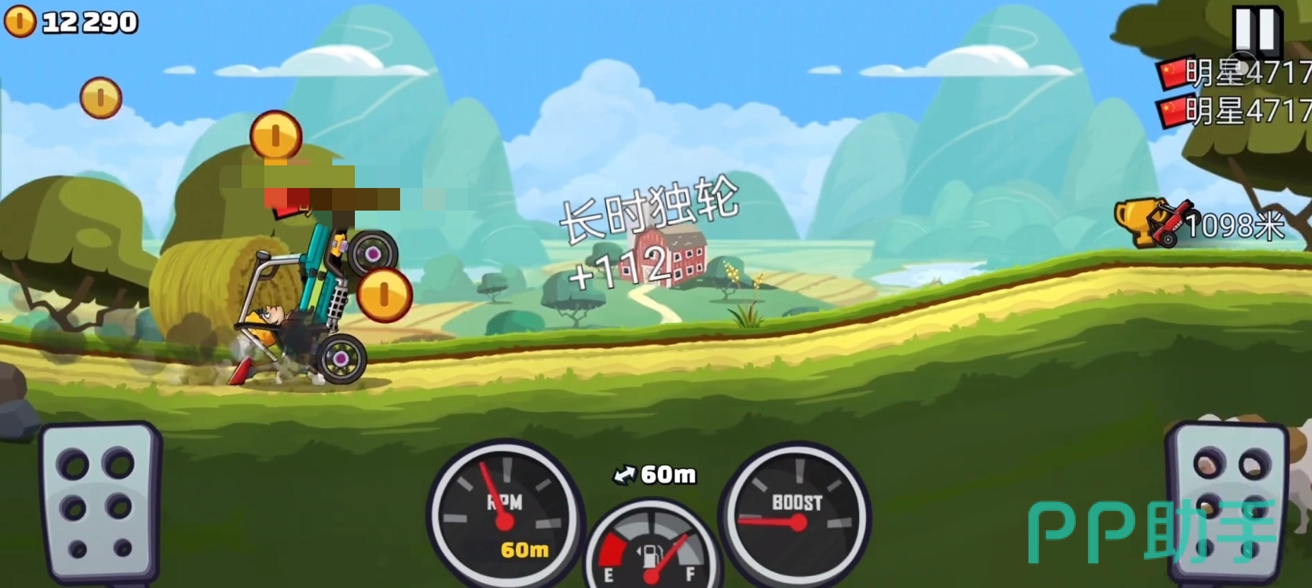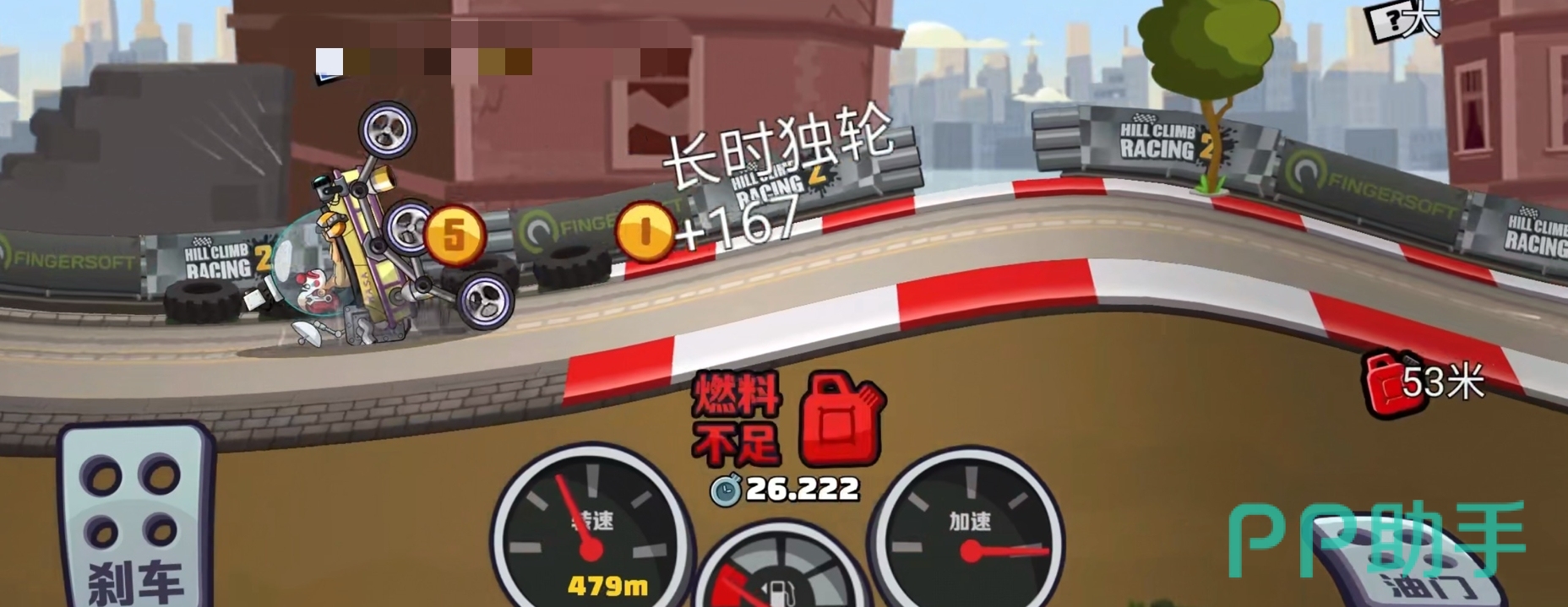 操纵最基础的mk2,零件推荐携带弹簧和扰流器,比赛开始的时候点一下加速键立马松开然后按一下刹车,接下来这辆就会一直使用后轮前进行驶,触发独轮加金币,而且速度也是相当慢的,在遇到上坡或者陡峭的路段的时候,可以适当的点击油门但是不要长按,这样时间越久跑的越远,金币也就越多。