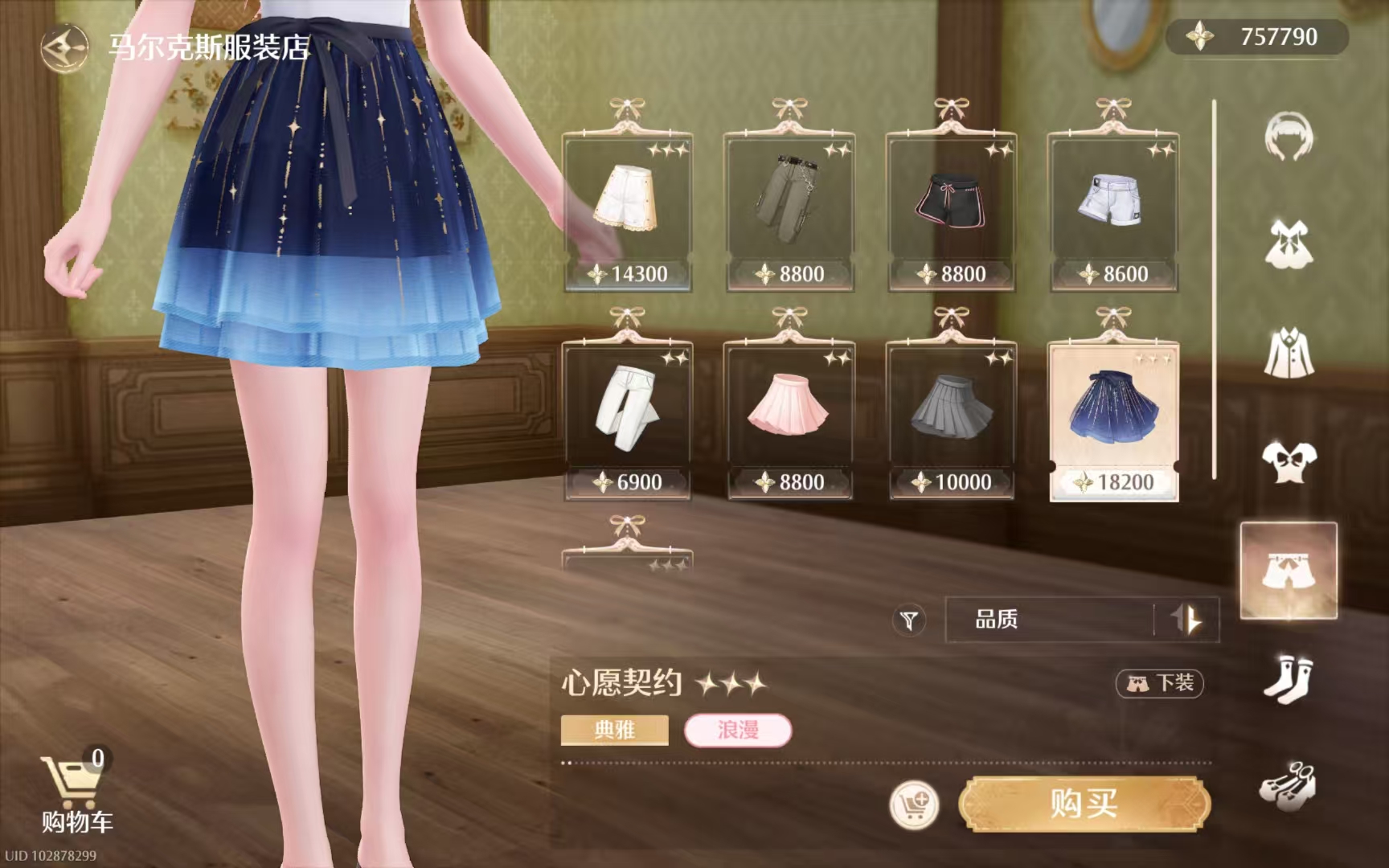 进入服装店之后,我们告诉店主小马尔克斯“想看看服装店的商品”后,准备好足够的金币,购买裤子界面的“心愿契约”短裙,注意此时我们需要有18200噗灵才能购买这条小裙子,完成我们的任务。