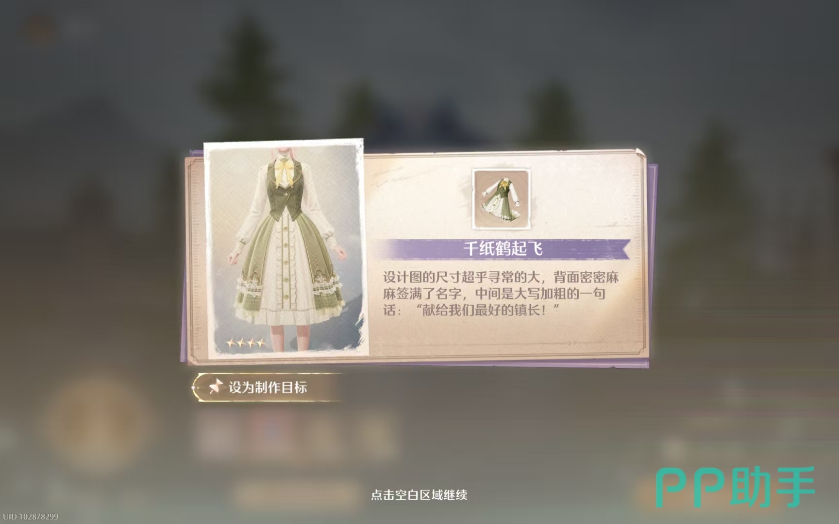 制作完“祈愿新生”的小裙子之后,我们点开地图传送到花愿镇的镇长宅邸前,到达这座宅邸前的雕像之后,穿上我们刚刚做的新裙子,也就是套装界面的“千纸鹤起飞”,与NPC艾柏进行对话之后就可以完成这个见闻任务啦!整个任务的难点在于灵感露珠的收集,整体难度一颗星,不过任务完成的收益小编觉得有四星哦!
