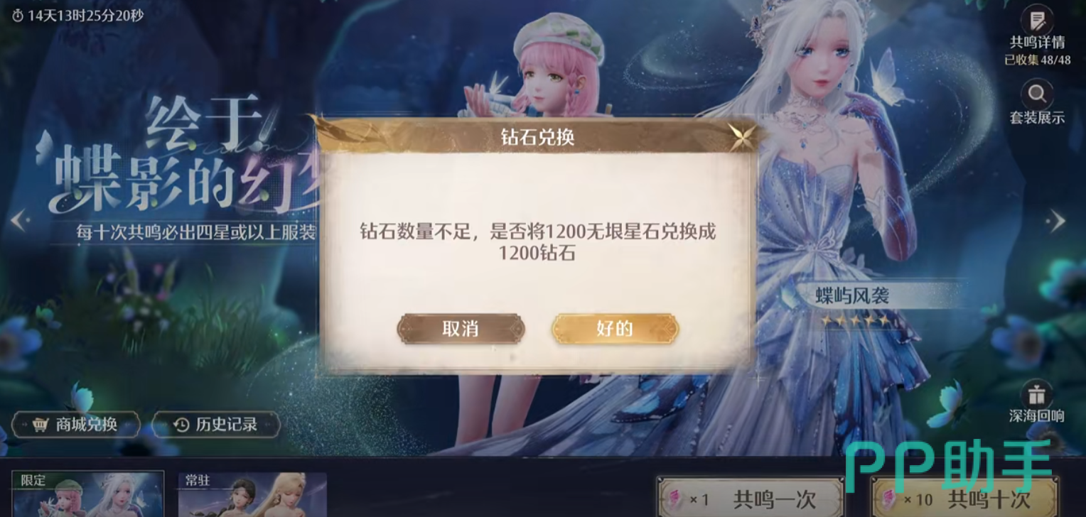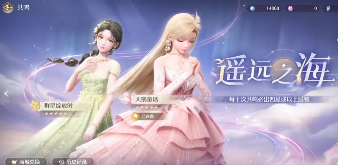 然后常驻共鸣卡池叫做遥远之海,我们可以用对应的共鸣水晶去抽取,不过能抽到的套装类型也很多,所以想要补齐一套的话就犹如大海捞针一般困难。然后常驻共鸣加入了特殊功能,第一次抽的时可以指定套装部件中的其中一件,下次抽取时就一定可以获得。