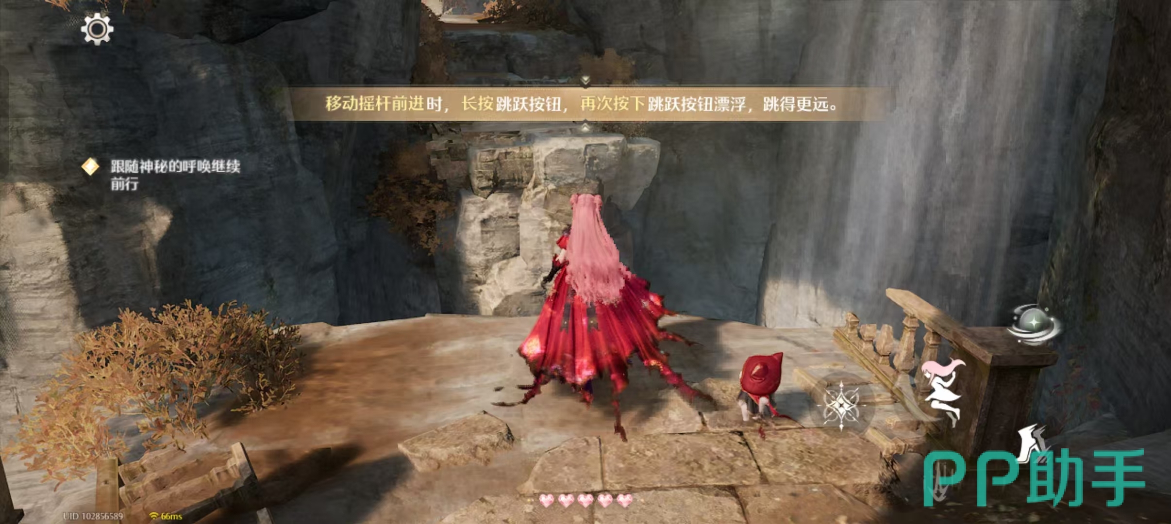 另外需要注意的是,在翻越一些较高的地形时,我们会在岩壁上触发一个短暂的攀爬点,再次长按跳跃起来时短暂形成的漂浮键时,可以帮助我们顺利通过这些较高的地形。