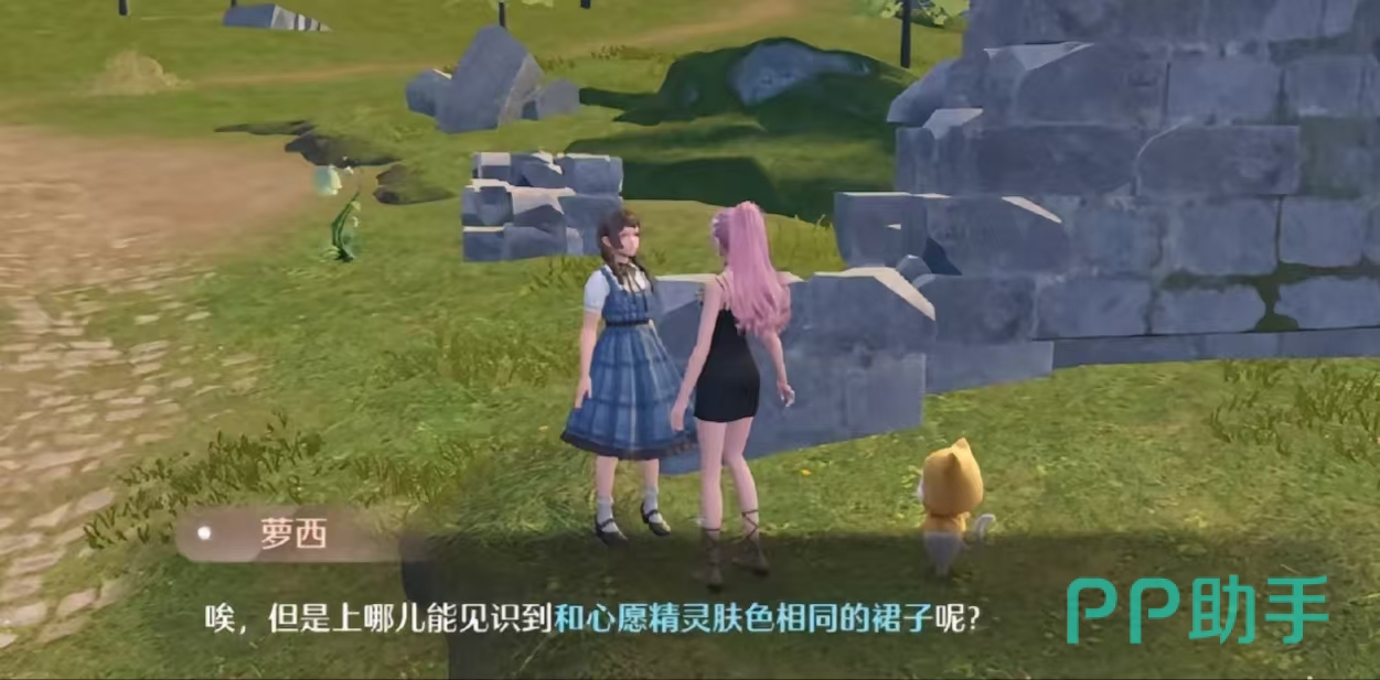 首先我们需要点击左边任务栏的见闻,切换当前见闻任务为“点亮灵感·伪装色”,追踪任务之后,我们跟随任务目标前往任务地点,找到这个见闻任务的NPC进行对话。通过与NPC的对话,我们得知要完成这个任务我们需要找到一条跟心愿精灵的肤色相同的裙子。