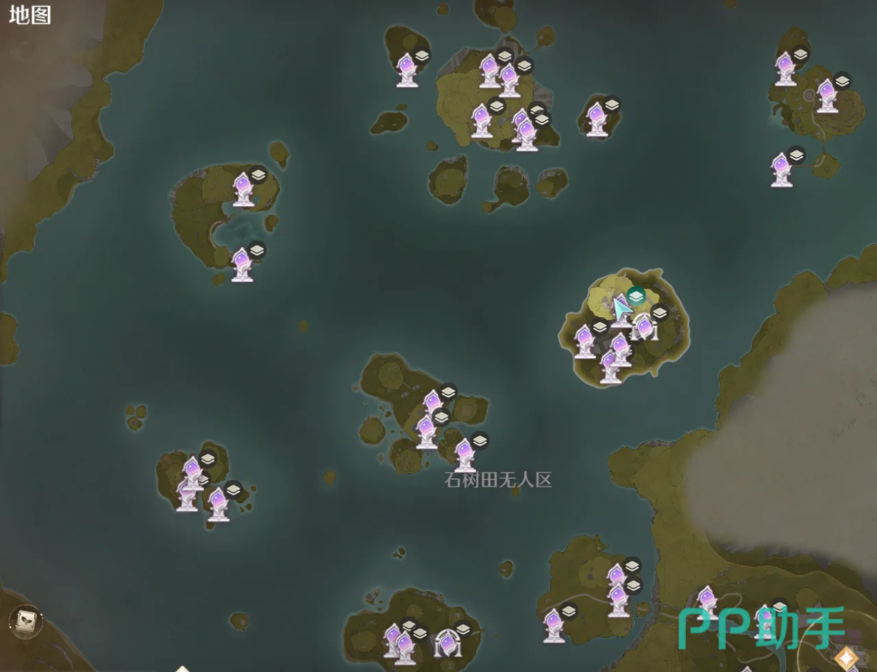 在石树田无人区域一共有三个传送点,已经在图中给大家点亮标注出来了,其中两个传送点都是靠近中心的位置,第三个传送点则是在无人区右下角的位置。在石树田这一块儿,小伙伴们都是需要用花朵漂浮套装才可以飘到很多地方去的,记得及时的更换一下,水母套装到不了。