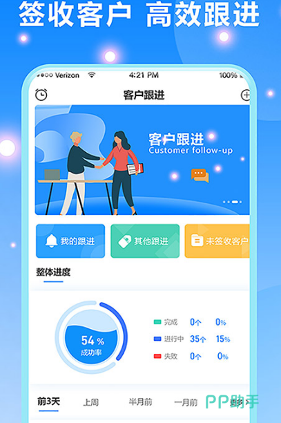 全面客户跟进app,从寻找客户到最后签约,整个流程全部都可以自由掌控并跟进,详细了解每位用户具体的实际诉求,并寻找到解决方式。每次与客户沟通细节的时候都会详细记录,另外还能够设置之后的沟通时间,沟通过后具体的记录可直接备份保存,避免丢失,通过具体的沟通情况详细分析出当前的订单跟进状态。