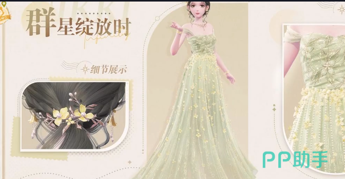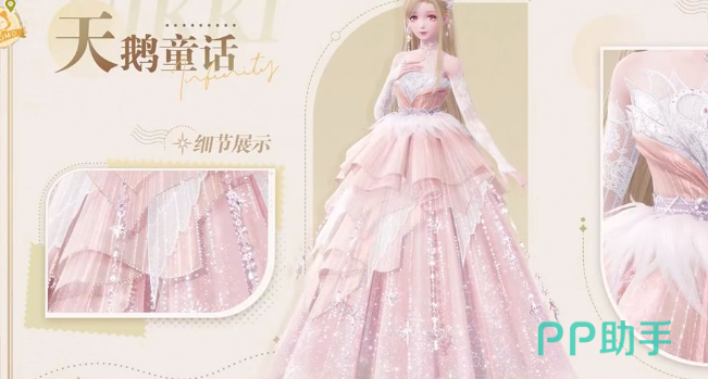 是一款象征浪漫的礼服,裙摆粉色轻盈,腰间还有一些白色的羽毛,给人带来一种朦胧的质感。犹如是天鹅羽毛一般柔软,另外还会展现出星光绽放,尽显浪漫。