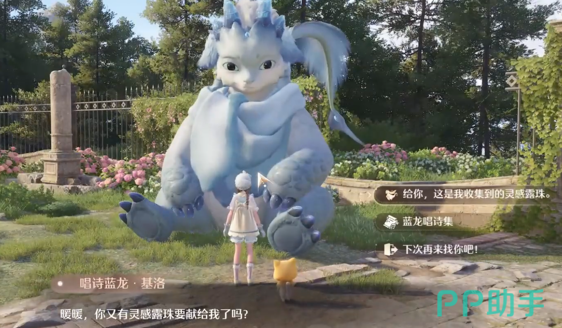 有关于灵感露珠的作用我们已经了解,那接下来就是实际操作了。首先,你需要找到蓝龙,这可是任务中最关键的NPC。蓝龙的位置相对简单,它就待在纪念山地水池附近。如果你已经解锁了这个区域的锚点,那么就可以直接传送过去,稍微走几步就能抵达。到了蓝龙所在地后,他会自动触发相关任务,我们需要等一会。