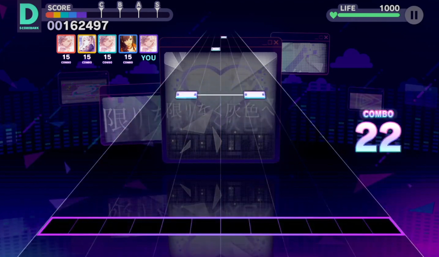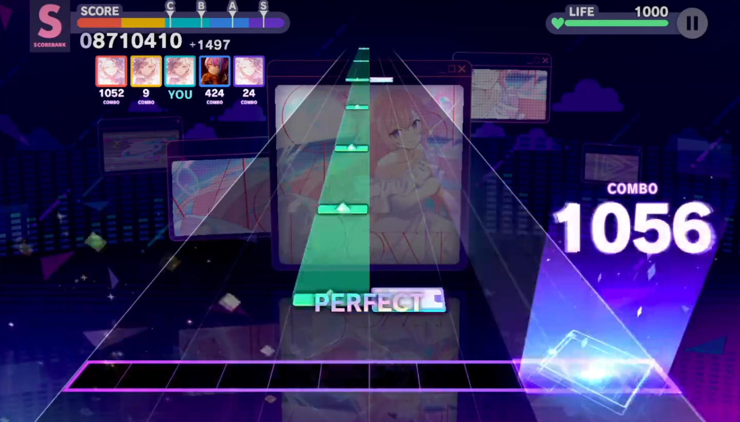 游戏内的谱面主要被划分为六大格的区域,当键位落下至判定线后只要根据这些键位的样式,去进行指定的动作判定就能得分,连续完成判定还能保持连击数,所得的分数也会更高,但要主要一失误连击就会断。每首歌的难度都不太一样,键位的下落频率在大部分情况下都会与音乐的节奏保持一致,在玩法上与同类音游有着很多的共通之处,因而在难度上对游玩过音游的玩家是不难上手的。