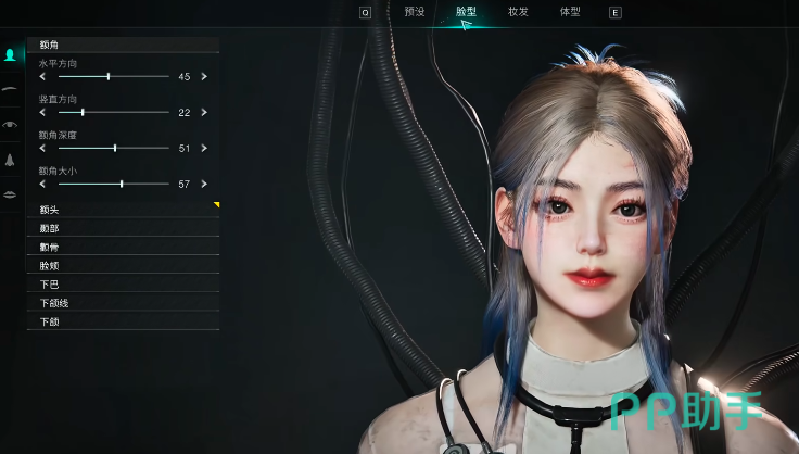 首先先做一个面部的预设建议可以选择女性预设当中第一排第二个,这个预设的五官比例非常符合御姐风的。再来看看额角调整,水平方向上建议调整到45左右,竖直可调整22,额角深度在51左右,额角大小为57左右,就可以让角色拥有一个比较饱满的额头形状。接下来再来看内部内部的水平方向、竖直方向、内部高度、内部角度、内部外翻、内部收缩这六个数据的数值分别是“77、87、38、55、57、47”。