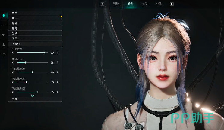 要想实现360度无死角,那么在侧颜方面下颌角是非常重要的,所以小编再来分享一下下颌线的具体调整,下颌线的调整包括五个数据,分别是水平方向、竖直方向、高度、角度、外翻,对应数据是90、28、49、38、65。脸型大致初步定下来了,再来对五官进行细节上的调整,在眉头调整方面,可将水平方向数据设定为32,竖直方向数据设定为62,眉头深度设定为47,眉头角度设定为77,眉头倾斜度要小一些,设定在10左右。