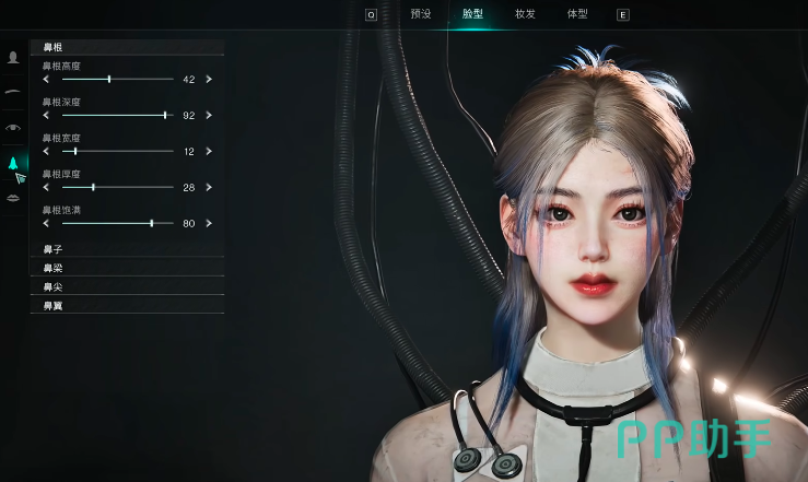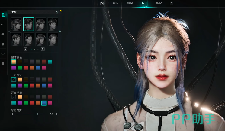面部好看度的提升,核心就是眼部构造啦,在眼睛的水平方向上控制在71左右,竖直方向控制在93,眼睛倾斜度在62左右,眼睛大小可调到82,眼睛深度可调到95,内外眼角小幅度调整即可,至于说发型的话,小编比较推荐第一排第二个非常的百搭,不仅可以完成整体发色的调整,还可以加入挑染。