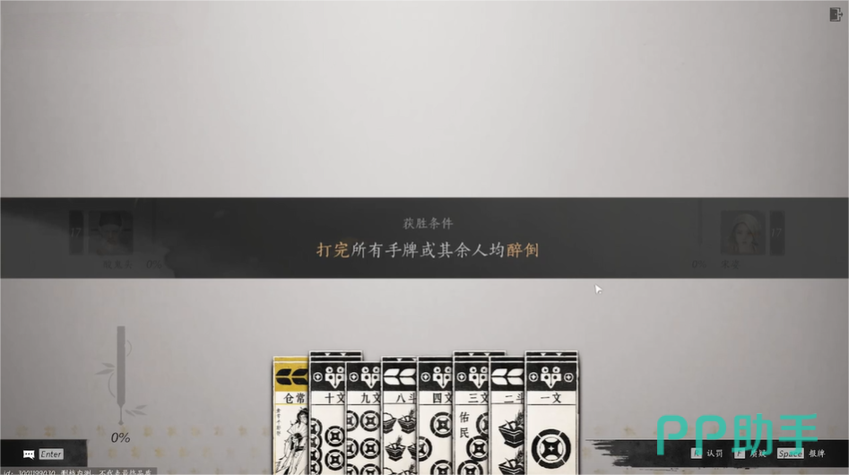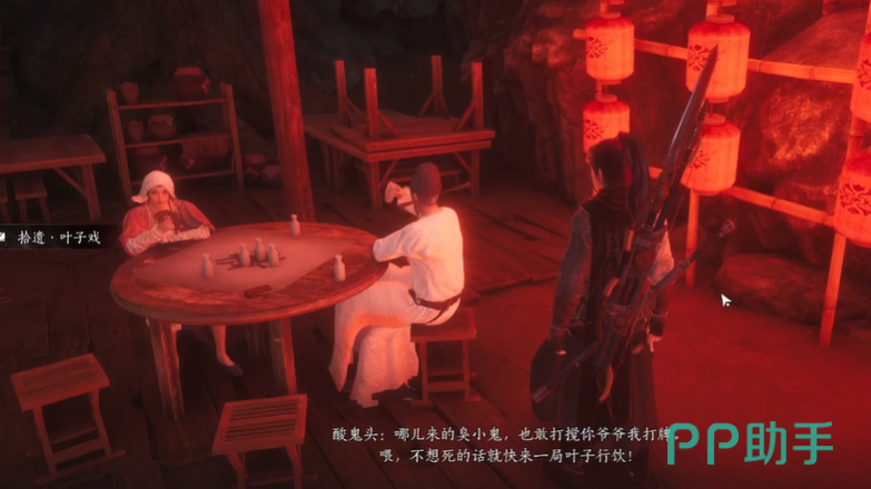 在钱财和气量都满足要求时,玩家便可开启“叶子戏”,玩家若想取胜便需要打完所有手牌,或者使其余人全部醉倒。而想要打完全部手牌,则需要玩家了解该游戏的规则。在场上的52张牌中有12张牌可以代替任意牌,其余40张牌为1~10各四张,游戏开始后,玩家需告诉其余玩家自己所出的牌为什么,若被质疑且质疑成功,出牌者便需要收回场上底牌,同时移交牌权。