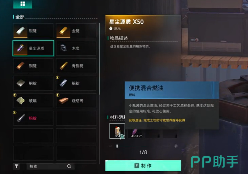 这项专精的妙处在于它的转换效率超高,原料也相对容易收集。在前期,星尘矿和小油都是可以通过日常探索和采集轻松获得的资源。然后,只需要通过石油工艺,你就能把这些基础资源转换成更为珍贵的星尘源质,这些源质将成为你后期制作强力物品和升级设施的关键材料。