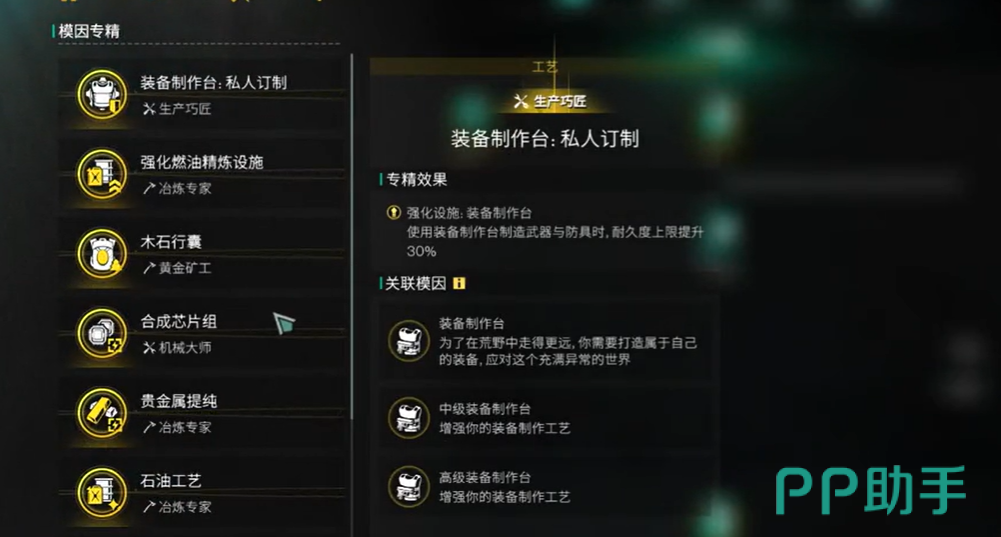石油工艺专精在七日世界中的解锁阶段是20到35级。这个阶段对于大多数玩家来说,正是游戏的一个关键过渡期。当你升到20级后,石油工艺就会直接出现在专精树中。它可以让你将15个小油和50个星尘矿合成为50个星尘源质,简直是一个资源转换的“超级工厂”。