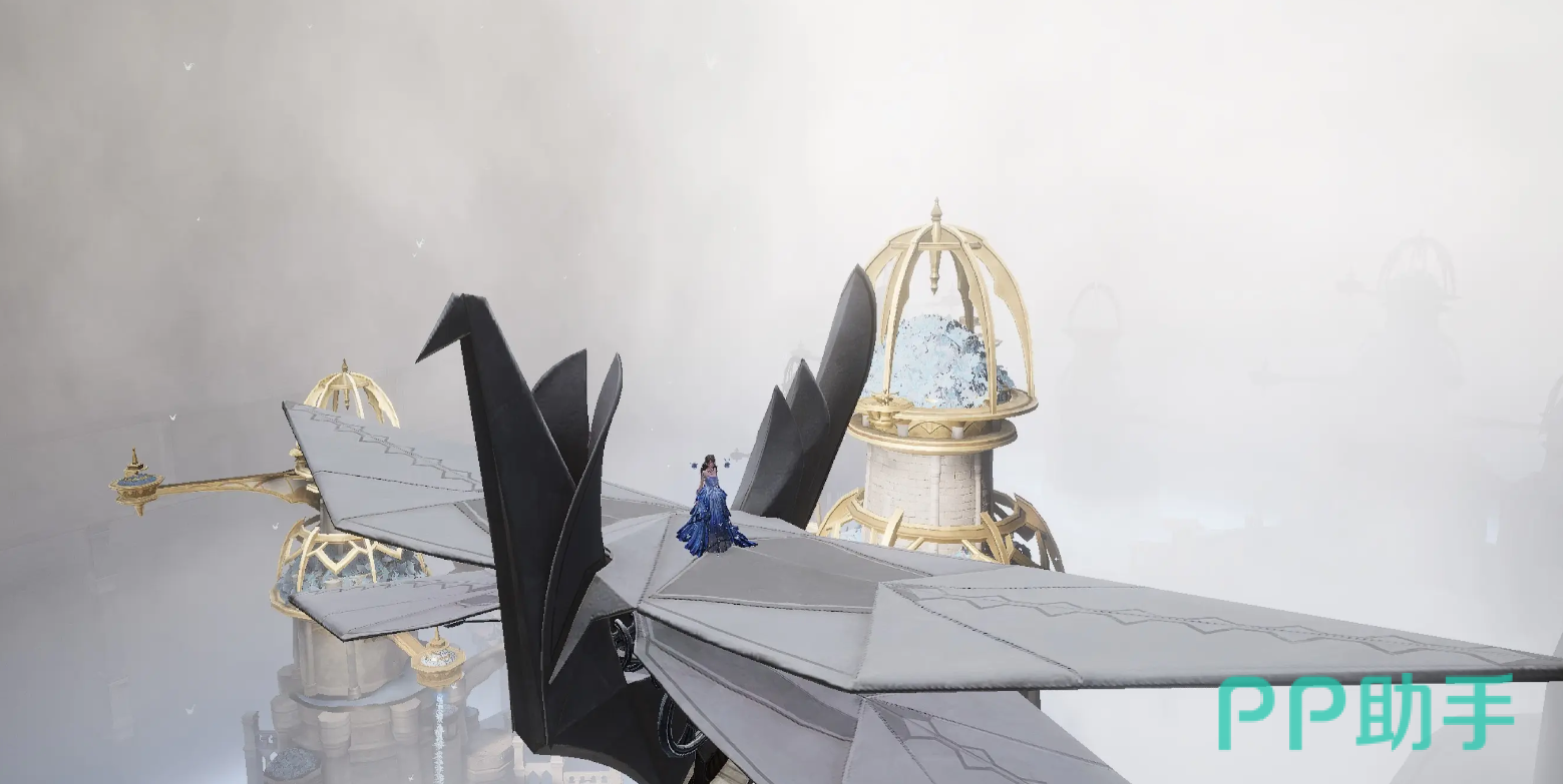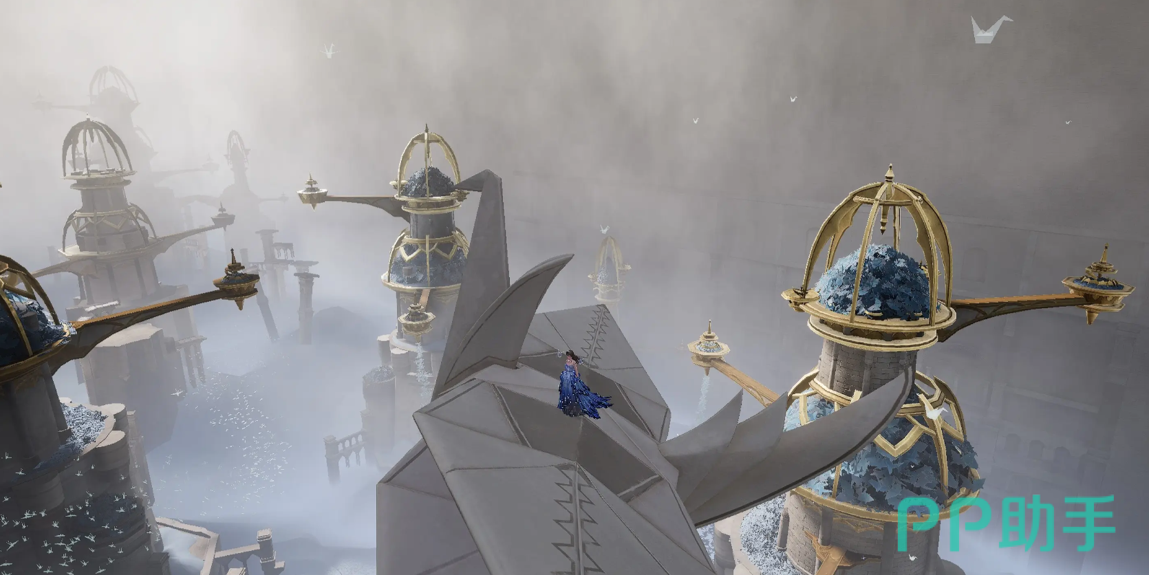 可以直接选择徒步,或是任务有关的传送阵抵达中心建筑,在中心建筑上面,整个呈现的是个圆柱形,姐妹们需要从这些碎片一般的“踏板”上面跳跃,这就是帮助大家登至高处的平台,飞花套也能帮助大家,越过二十多个台阶,大概就到最高的塔尖处了,等到千纸鹤飞到面前,纵身一跃,就能成功骑在千纸鹤身上了。