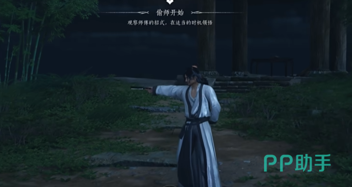 以积矩九剑偷师为例,流程前段忽略,最后场景中会有3个NPC,当他们向着反方向走的时候靠近击杀第一个,然后上楼也是用同样的方法偷袭,然后按照指引来到偷师地点。