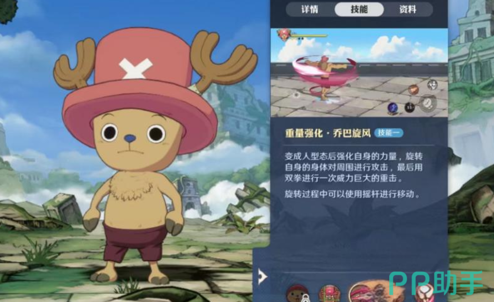 说到乔巴这个角色的技能,分别为乔巴铁拳跟乔巴旋风,其中乔巴铁拳用来攻击前方,一旦施展形成一定范围内的伤害。而乔巴旋风是在y轴比拼上获得对应的机会 。乔巴旋风一旦施展之后会变成人形态旋转,其实这个时候也会对周围进行攻击,最终形成了一种威力特别大的重击。