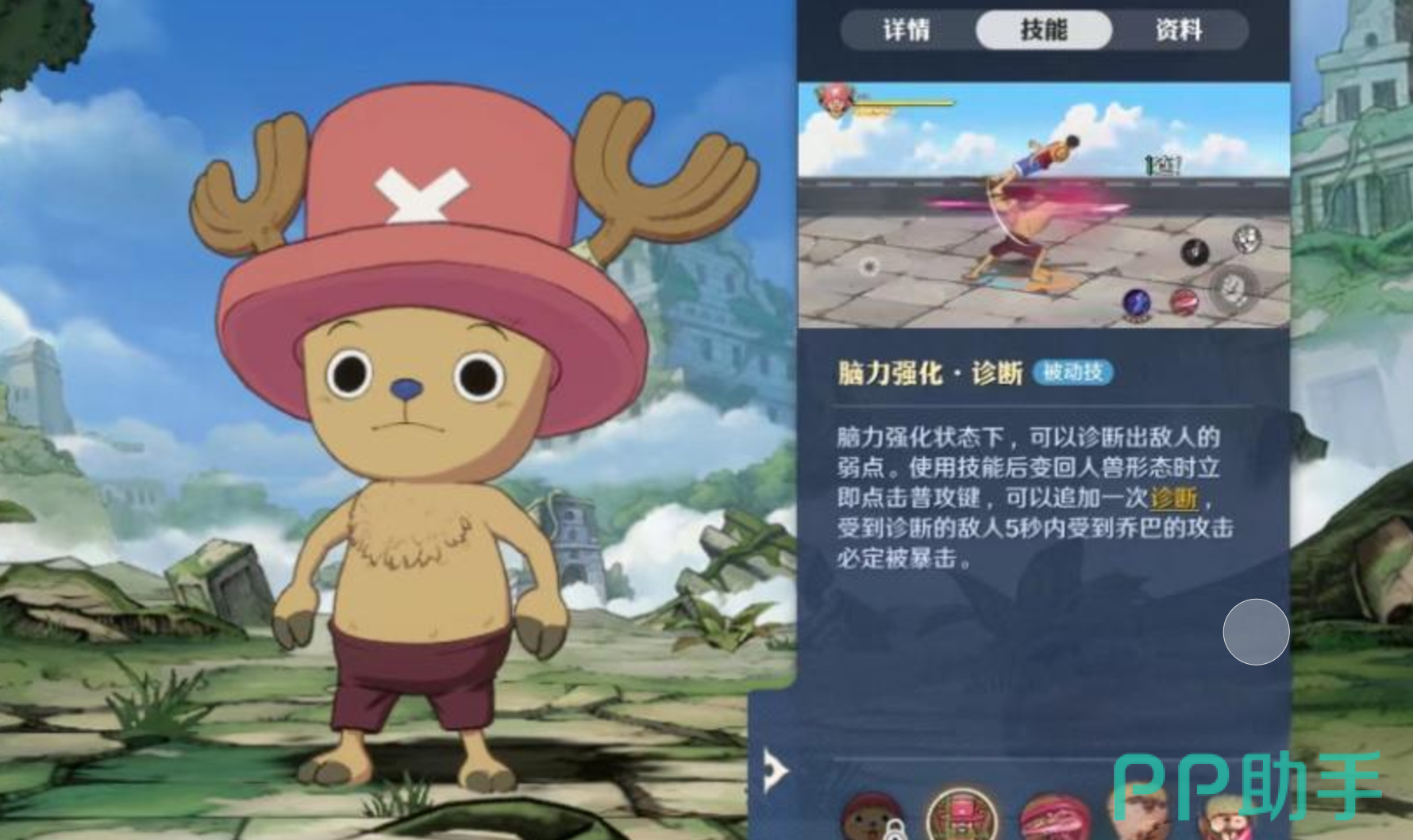 乔巴的被动技能是脑力强化诊断,通过它的诊断能够判断出对方的弱点,并且在5秒以内就直接给对方造成伤害。乔巴的大招是强化筋肉直接变成强化的状态,进而能够直接攻击,可以产生多次打击,就会出现特效。