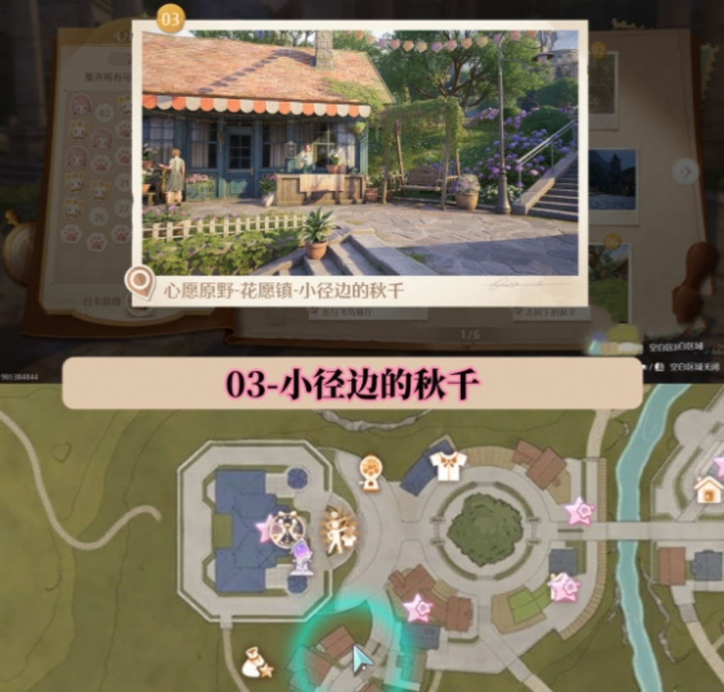 在打卡的时候,玩家发现了一个非常具备童趣的打卡位置,这个位置位于小径边的秋千处,秋千能够让很多玩家回忆满满。而古树上的秋千其实也是一个打卡点,这个位置在古树下,玩家在打卡的时候可以悠闲的荡秋千。另外莉莉娜雕像也作为打卡点。