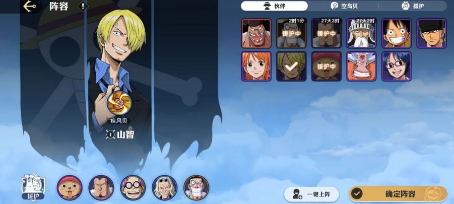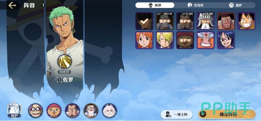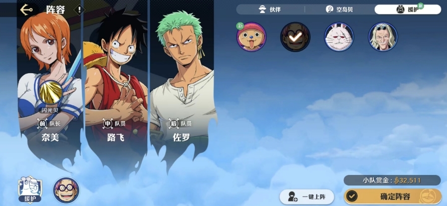 此外还有助战伙伴如可以在烟鬼和巴奇当中选,他们可以在关键时刻加入战斗,增强队伍的实力,在出场顺序上,通常建议先派出佐罗进行近战攻击,然后是奈美的远程支援,最后由路飞进行群体攻击,这样的安排可以根据对手的不同特点进行调整,以最大化利用每个角色的优势,另一种常见的阵容是长鼻子阵容,它由阿龙、撒谎布和福克斯组成。