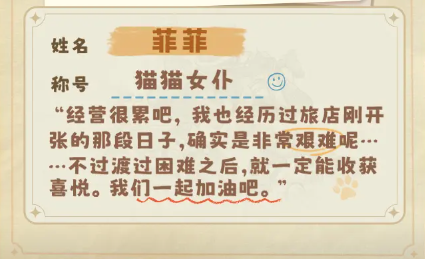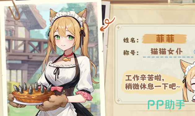 菲菲是一位在旅店工作的女孩,她性格温和,像普通人一样追求着简单而幸福的生活。在游戏中,菲菲不仅是经营旅店的一把好手,更是旅店餐厅和咖啡厅的得力助手。她以温柔可爱的点单服务,吸引了大量顾客,使得旅店和咖啡厅的生意异常火爆。菲菲的这种经营天赋,无疑为玩家在异世界的生活增添了更多色彩和乐趣。