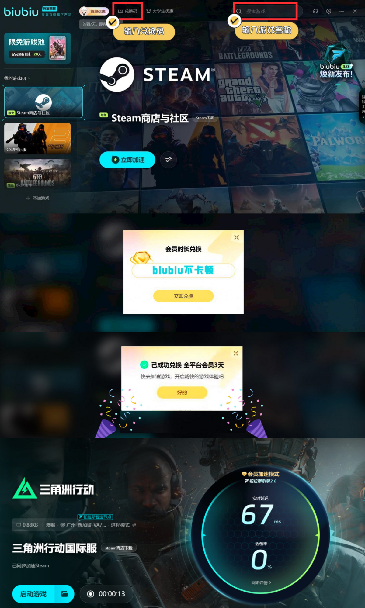 此外,现在所有平台用户,都能输入口令【biubiu不卡顿】来兑换72小时加速时长,这对于广大新用户而言,叠加后便是96H哦,如此就能去为自己喜欢的格列游戏作品开启加速了,享受稳定且丝滑的体验效果。