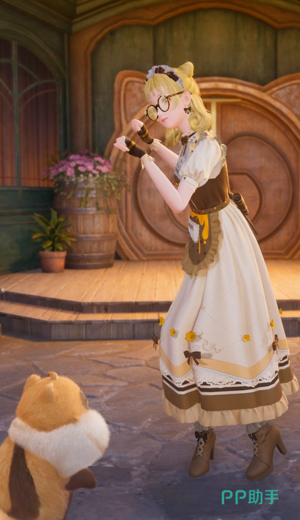 第三套“甜润蜜糖”,这个装扮整体都非常可爱,可爱的发型,可爱的围裙,整个呈现一种“咖啡女仆”的感觉,是咖色和黄色为主,眼镜设计的也非常有特点,呆萌呆萌的。
