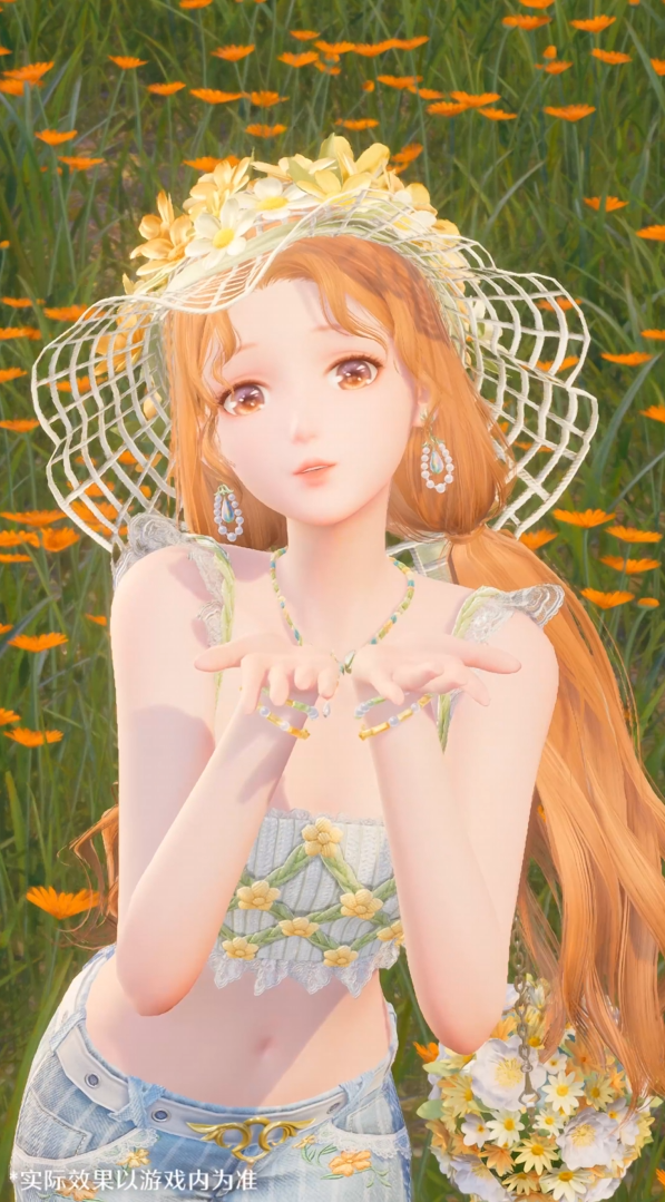 第四套“晴日悠行”,非常亮眼清新的一套搭配,下半身牛仔裤,上半身小吊带,戴着一个太阳帽,整体清新又不失性感,还搭了一个花球链条包,晴日里的小太阳装扮。