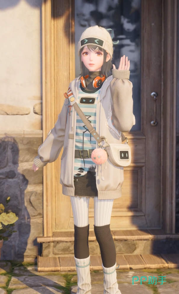 第二套“暖绒行动”,这套就和它的名字一样,整体看起来就暖融融的,非常温暖的套装,白色是主色调,搭配一些粉色绿色的元素点缀,画龙点睛,让服装温暖的同时也具有活力,非常适合初秋的一套搭配。