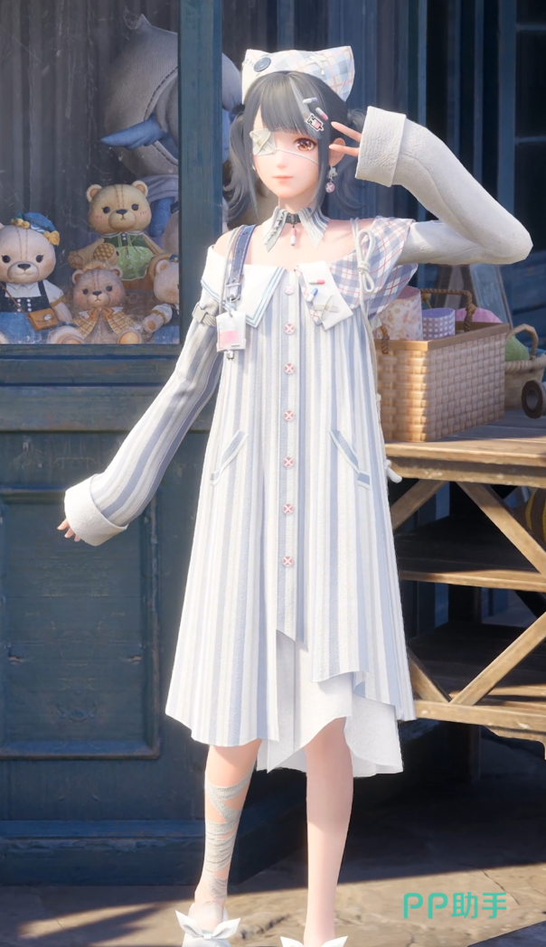 最后一套“实验奇想”,该服装很有实验感,有点类似“病号服”的裙子,以及护士帽的造型,外加一个具有特点的眼罩,搭配小输液包和药丸,非常的可爱。