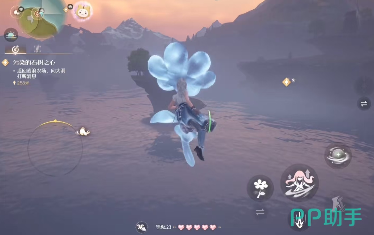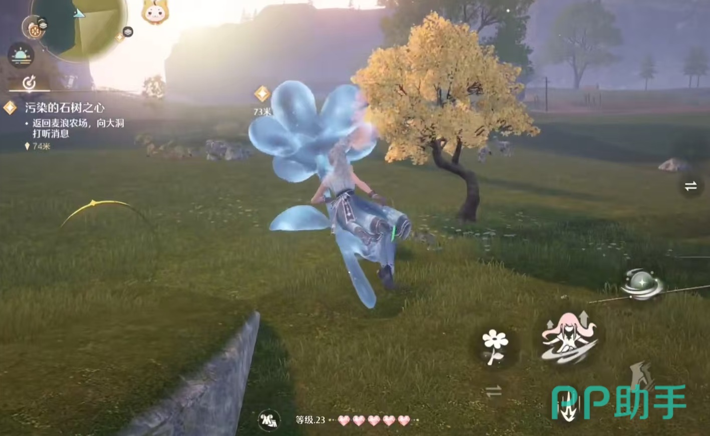 切换成能够飞行的套装,直接从原地飞往中间无人岛就可以了,到达之后正好落地,然后以跳跃方式不断往上攀登,借助一朵往上喷气流的蓝色花,继续以滑翔方式往目的地进发,中间会遇到另外一个喷气流花,经过两次喷射加速,就能到达目的地麦浪农场了。其实游戏中还有很多地方都需要借助各种神奇能力套装才能到达。