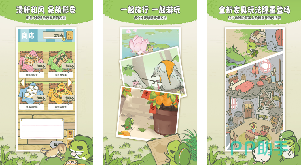 洋溢着日式味道的养成经营之作,玩家会和一只小蛙共度时光,它在你的田园居所中学习新知、日渐成长,还不时会踏上探索之旅。小蛙在旅程中会搜集美食与物品,这些能经由栽培三叶草或在商铺运用兑换券来取得。玩家可期盼小蛙带回的旅途回忆快照,以及各地多样的土特产。