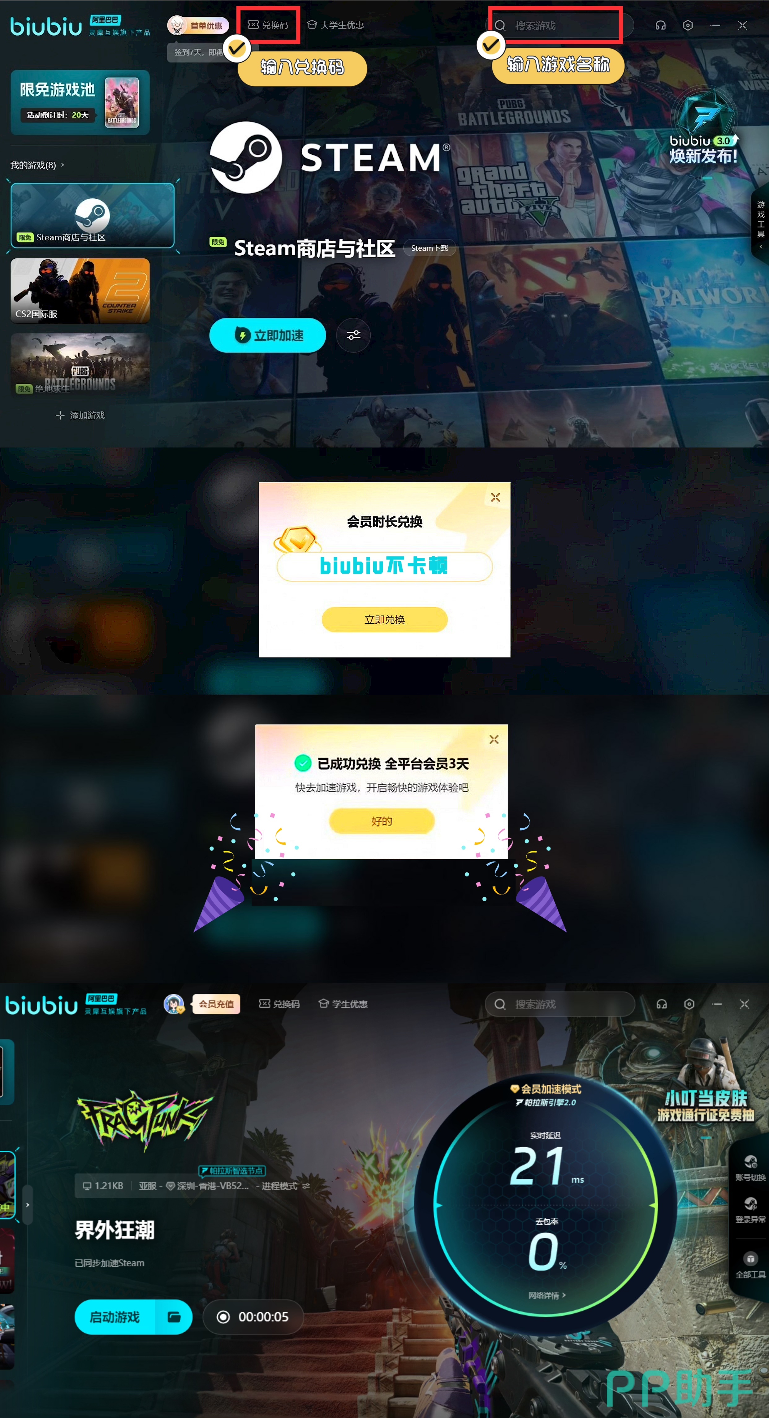 该大作目前锁国区,所以在我们的原始区域内无法找到并开始。所以可先用biubiu提速,方能登录其他区域并迅速下载。新用户的话可以领取24小时的免费加速,另外新老用户键入【biubiu不卡顿】,可额外获得三天免费加速。