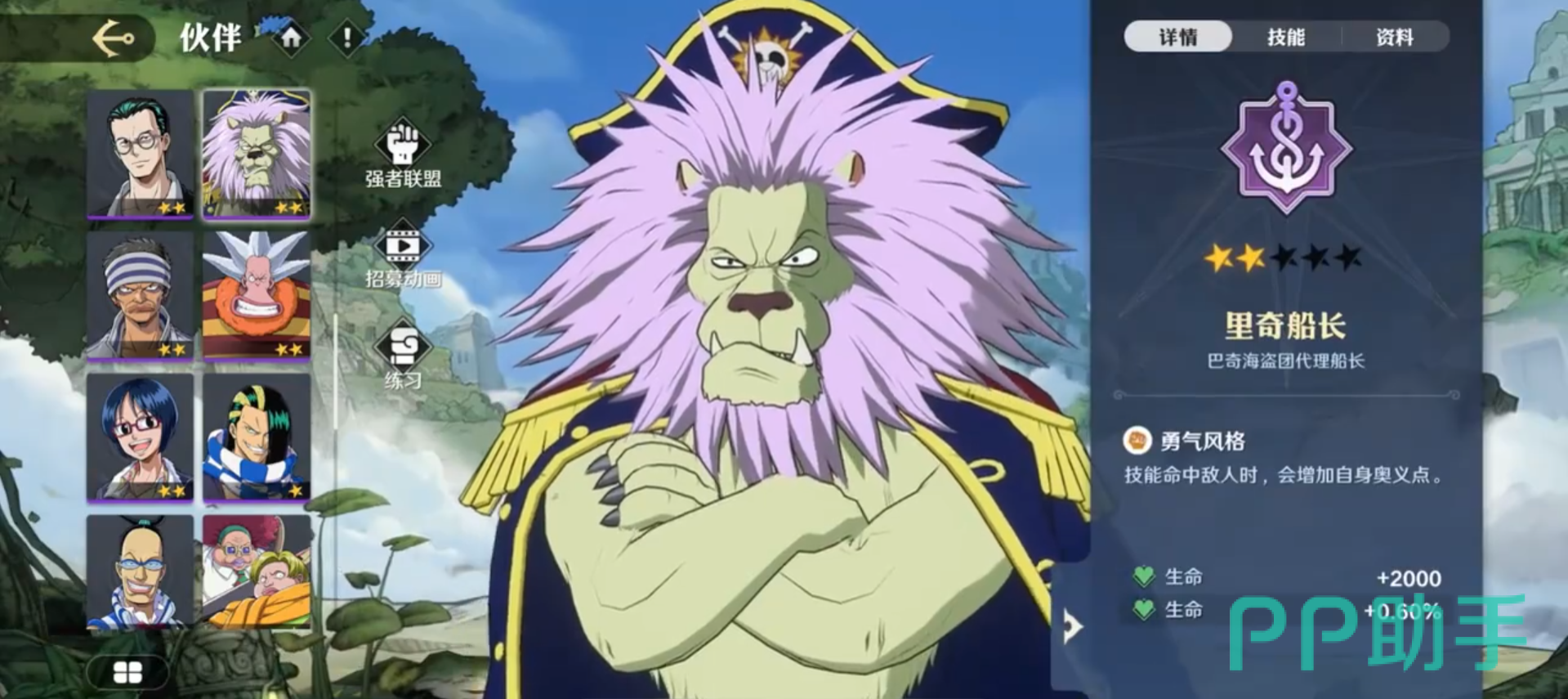 航海王壮志雄心里奇船长强不强?里奇船长其实是一只看起来憨憨的狮子,外形是狮子的他看起来非常的霸气,战斗风格也为勇气,有不少伙伴对这个狮子的技能机制比较好奇,想知道他的强度如何,接下来当然是满足大家的要求,详细来给小伙伴们阐述一下该角色的技能情况。