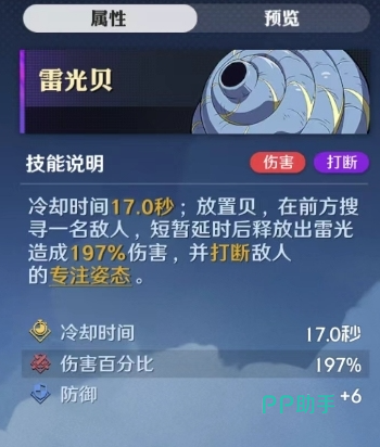 雷光贝冷却时间同样是17秒,放置使用,它会自动在前方搜寻敌人,在经过短暂延迟后释放雷光造成打击,并干扰敌人的攻击,这算是一个提前锁定类的,比较适合灵活类英雄使用。