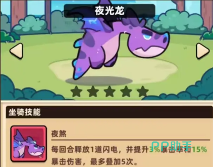 首先坐骑方面推荐选夜光龙,它的技能是每回合释放一道闪电,并提升自身3%的暴击率和15%的暴击伤害,总共可以叠加五次,坐骑技能的话只有上场的那一个可以发动,但是只要拥有也能发挥效果,所以大家也可以多多收集,其他的比方说金刚、葡萄也都很不错。